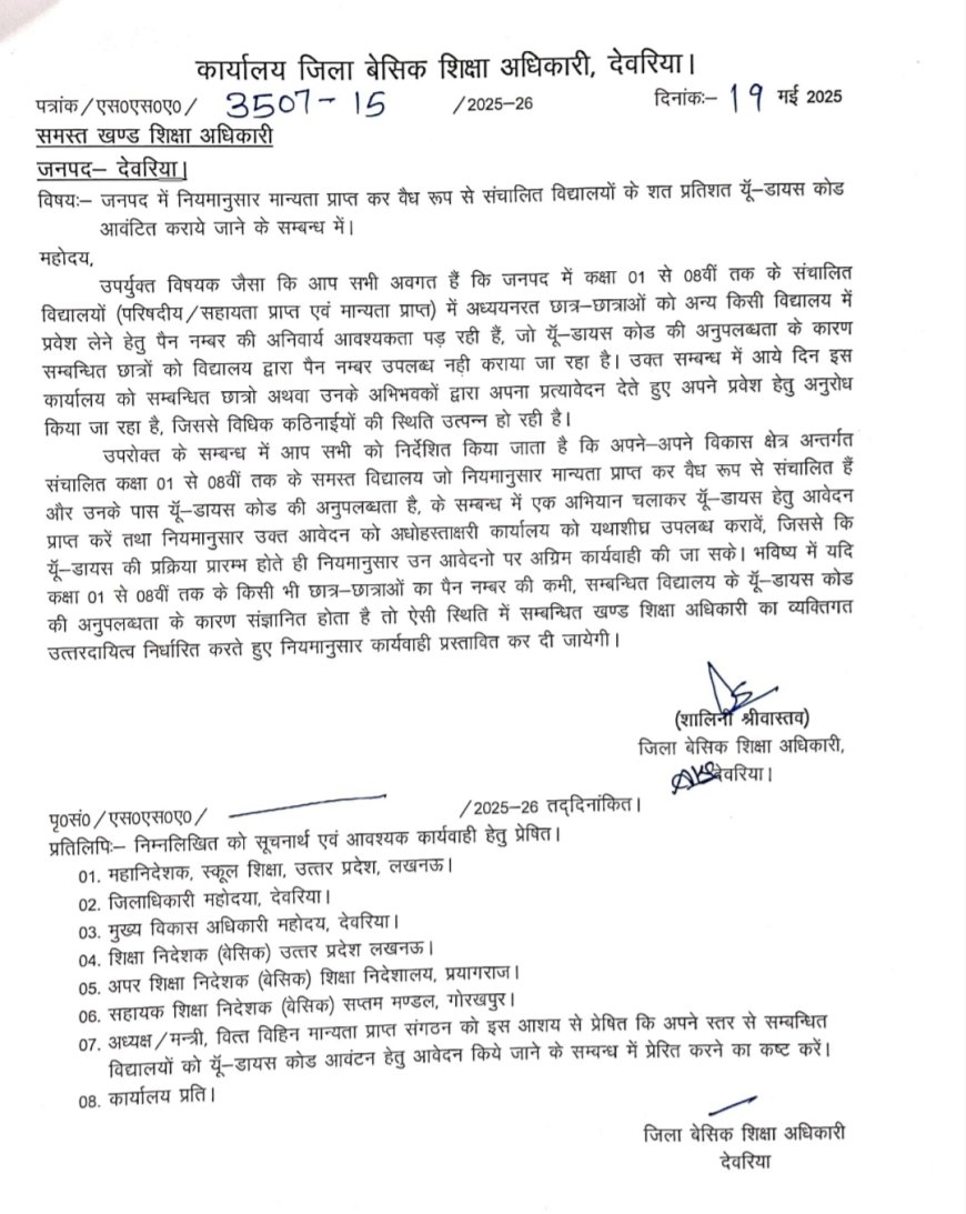 देवरिया । जिला बेसिक शिक्षा अधिकारी शालिनी श्रीवास्तव ने सोमवार को पत्र जारी कर जनपद के समस्त खण्ड शिक्षा अधिकारी को निर्देश जारी करते हुए पत्र माध्यम से अवगत कराया है कि जनपद में नियमानुसार मान्यता प्राप्त कर वैध रूप से संचालित विद्यालयों के शत प्रतिशत यूँ-डायस कोड आवंटित कराये जाने है जिसमे कक्षा 01 से 08वीं तक के संचालित विद्यालयों (परिषदीय/सहायता प्राप्त एवं मान्यता प्राप्त) में अध्ययनरत छात्र-छात्राओं को अन्य किसी विद्यालय में प्रवेश लेने हेतु पैन नम्बर की अनिवार्य आवश्यकता पड़ रही है, जो यूँ डायस कोड की अनुपलब्धता के कारण सम्बन्धित छात्रों को विद्यालय द्वारा पैन नम्बर उपलब्ध नहीं कराया जा रहा है।