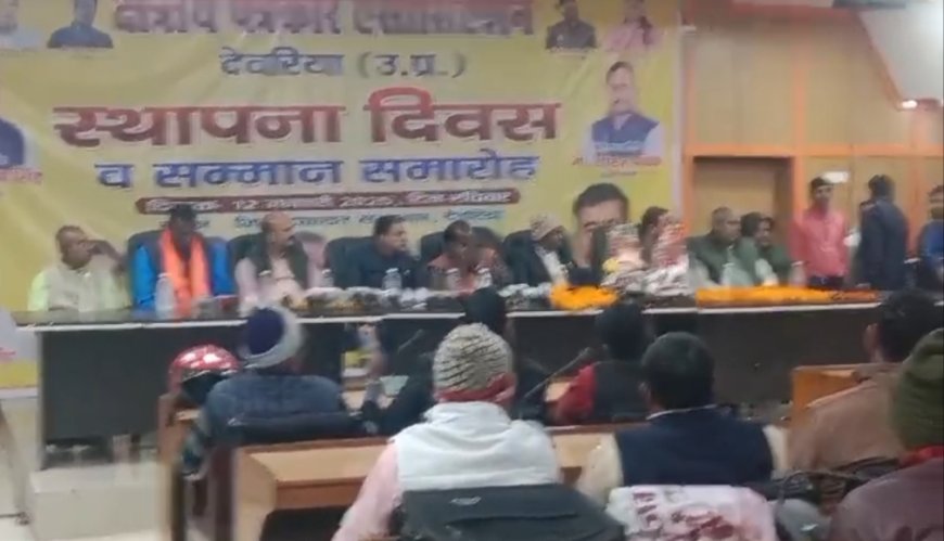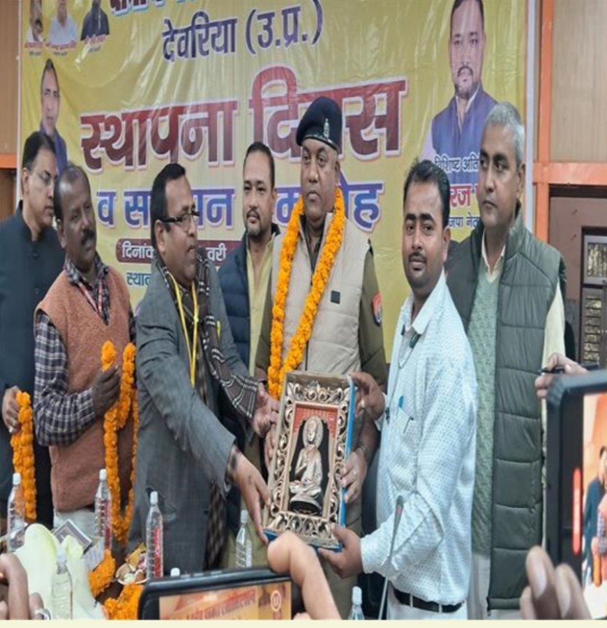 देवरिया । जनपद के जिला पंचायत सभागार में स्वामी विवेकानंद के जन्मदिवस के अवसर पर क्षेत्रीय पत्रकार एसोसिएशन के तत्वाधान में पत्रकार सम्मान एवं स्थापना दिवस का आयोजन बड़े ही उत्साह के साथ मनाया गया। आयोजन के अवसर पर मुख्य अतिथि बसपा नेता रामशरण सिंह सेंथवार एवं विशिष्ट अतिथि भाजपा नेता धीरज पाठक रहे। कार्यक्रम की शुरुआत स्वामी विवेकानंद जी के चित्र पर माल्यार्पण कर किया गया। कार्यक्रम की अध्यक्षता सगठन के राष्ट्रीय अध्यक्ष कमल पटेल एवं जिला अध्यक्ष मृत्युंजय प्रसाद के नेतृत्व में किया गया। कार्यक्रम में आए पत्रकार साथियों को मोमेंटम एवं माल्यार्पण कर सम्मानित किया गया। कार्यक्रम में विशिष्ट अतिथि के रूप में पहुंचे सदर सीओ संजय रेड्डी ने मंच साझा कर सुंदर गीत प्रस्तुत कर पत्रकार साथियों का मनोबल बढ़ाने का कार्य किया जिससे मौजूद पत्रकार साथियों ने तालियों से अभिभादन किया सदर सीओ का अभिवादन किया।